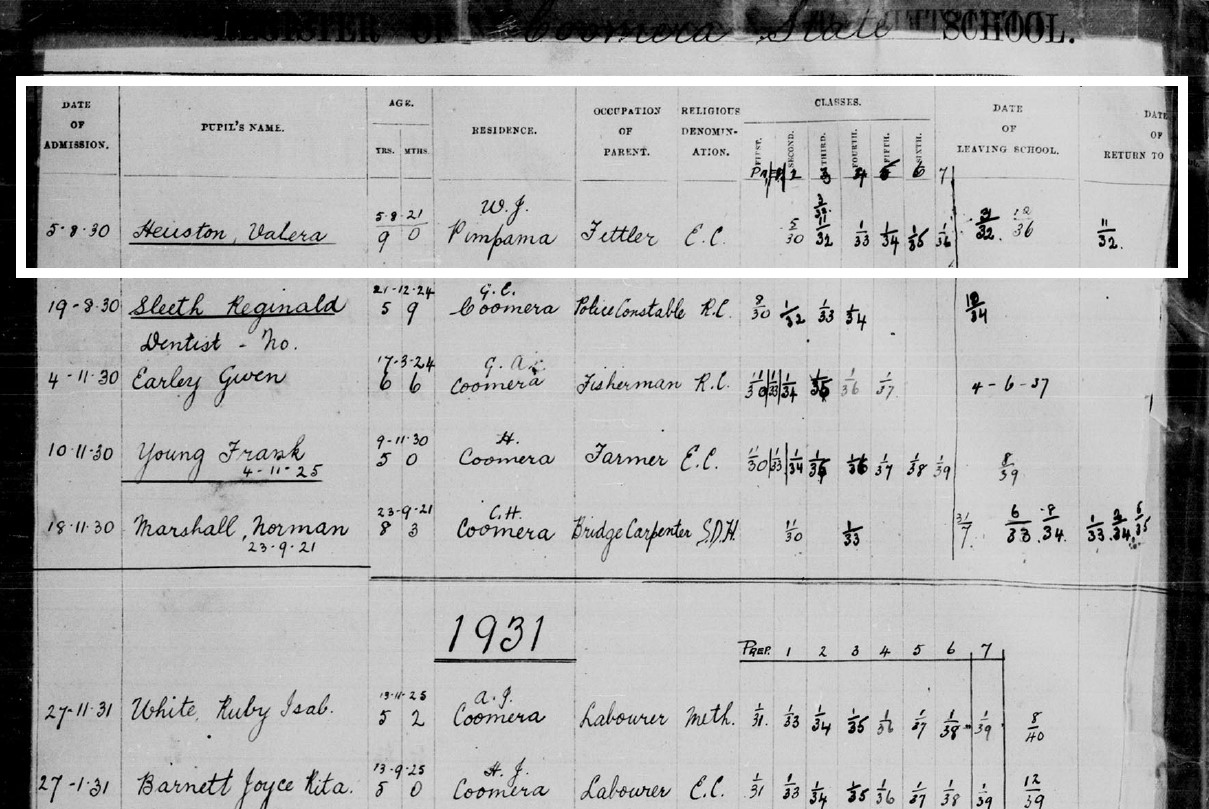 Valera Valentine Heuston was born on the 5th of August 1921 in Charleville Queensland to Mr William John Heuston and Mrs Rose Ellen Heuston (nee Lowe). As the eighth of their 12 children. His older siblings were (oldest to youngest) Andrew (died at birth), Eric, Narelle, Minerva, Geoffrey, Adolph and Frederick. His younger siblings were (oldest to youngest) Colin and Vivian (twin boys), Athol (died in infancy) and Ronald. His father William served in the First World War with the 21st Machine Gun Company where we was Wounded in Action during a gas attack. The early life of Valera is somewhat obscured as the family seems to have moved frequently. However, we know that Valera attended Coomera State School from 1930 to 1936 where completed schooling from grade 2 to grade 7 with the family address given as Pimpama and his father’s occupation listed as a settler. Additionally, his younger brothers Colin, Vivian and Ronald also attended Coomera State School until at least 1939, with the family address listed as Coomera. By 1940 the family had moved to Ipswich. At the time of his enlistment on the 1st of July 1940, Valera was living with his parents at Ipswich where he worked as a labourer.