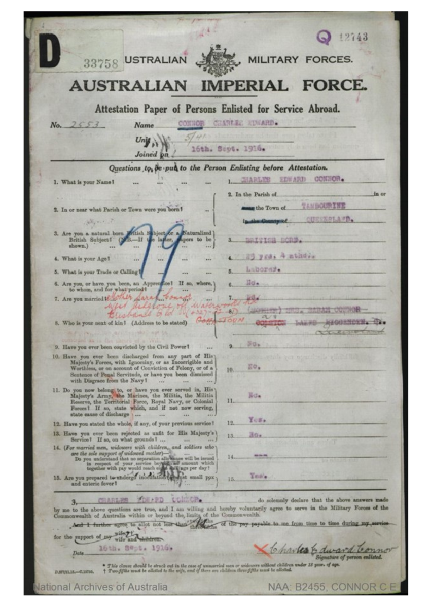 Charles Edward Connor was born on the 21st of June 1891 in Tamborine, Queensland. to Mr James Connor and Mrs Sarah Ann Connor (nee Cooper) as the 5th of their 8 children. His elder siblings were (from eldest to youngest) William, James, Mary and John (died at birth). His younger siblings were (from eldest to youngest) Herbert, Kathleen and Doris. Before his enlistment, Charles worked as a labourer.
