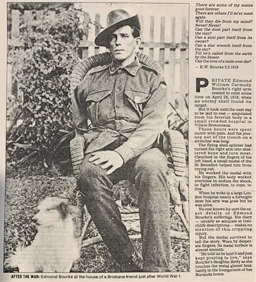After returning to Australia, Pte Burke was married with multiple children and died June 1979. He has been featured in several commemorative newspaper articles which reveal him to be an enthusiastic amateur poet. These articles also make it clear that while his preferred name was Edward, His full name is Edmond William Carmody Bourke, which is confirmed by Births Deaths and Marriage’s Queensland (13-06-1891).