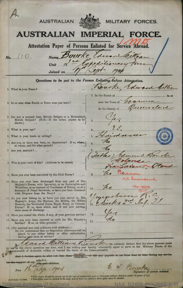 The surviving Bourke first enlists in Townsville on the 14th of August 1914. This is an enlistment with the Australian Naval and Military Expeditionary Force (AN&MEF) to participate in the expedition to capture German New Guinea and Germany’s southern Pacific possessions (Service Number: 1782). This is a separate force to the AIF and Pte Bourke was discharged from this special force on the 18th of September 1914 in Townsville. He did not serve in New Guinea as he was discharged “on account of the trouble caused by the firemen on troopship”, which essentially means that the troops from Townsville could not be transported to the warzone due to strike action by ship crews. At any rate his services were not immediately required by the Crown.