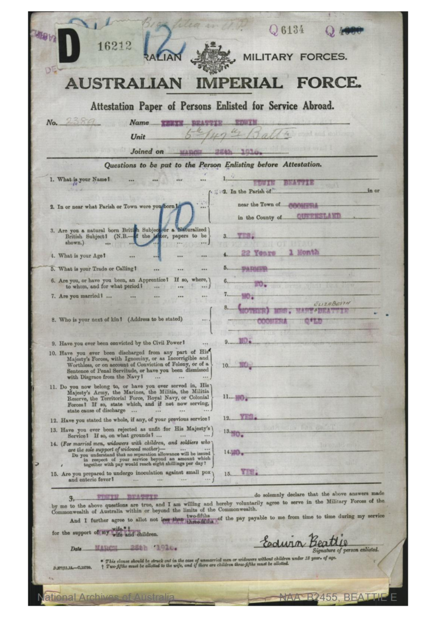 Private Edwin Beattie was born on the 10th of March 1894 in Coomera, Queensland, to Mr John Beattie and Mrs Mary Elizabeth Beattie (nee Harding) as the youngest of their 10 children.