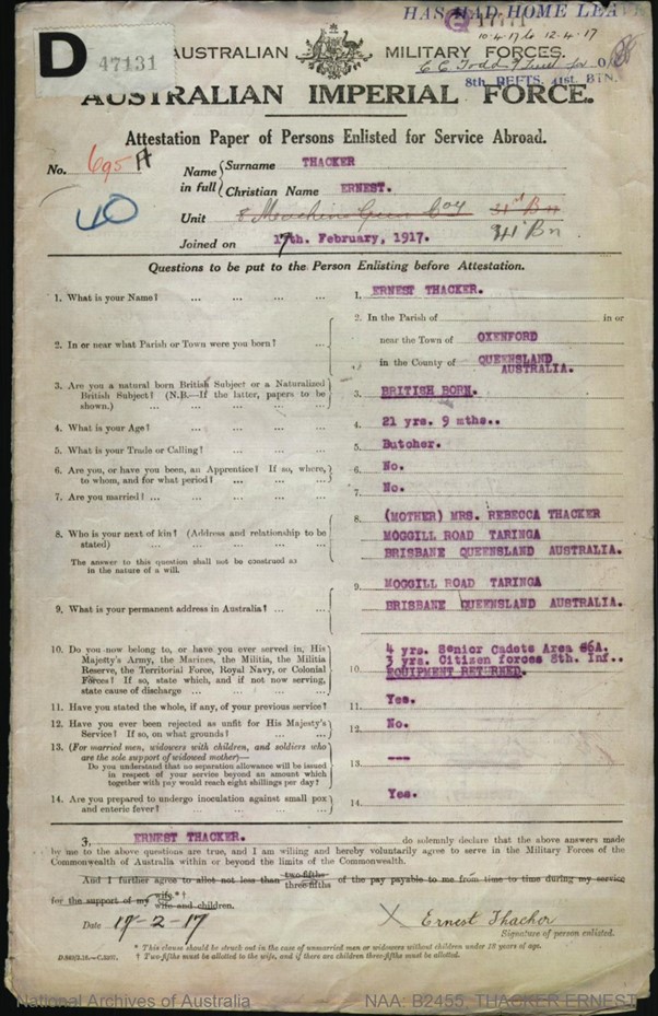 Ernest John Thacker was born in Oxenford, Queensland, on the 5th of May 1897, to Mr Charles Edwin Thacker and Mrs Rebecca Jane Thacker (nee Gilpin) as the youngest of their three children. His older siblings were (from eldest to youngest) his sister Amy and his brother William. His father Charles was a railway worker who was tragically killed by a lightning strike on the 10th of January 1900 while working near Cunnamulla Queensland; Ernest was aged 2 years and 8 months at the time. His widowed mother remarried in 1904 to her new husband Thomas William Dorestt. Their only son David was born one year later, giving Ernest a half-brother. Prior to the War Ernest also served in the cadets and citizen forces while plying his trade as a butcher. Ernest enlisted on 17th of February 1917 and his brother William enlisted about a week later on the 23rd of February 1917, possibly intending to serve together. However, this was not to be as William was assigned to the 15th battalion and Ernest was assigned to the 41st Battalion. The 41st Battalion was raised at Bell's Paddock Camp in Brisbane in February 1916 with recruits from Queensland and the Northern Rivers district of New South Wales. It formed part of the 11th Brigade of the 3rd Australian Division