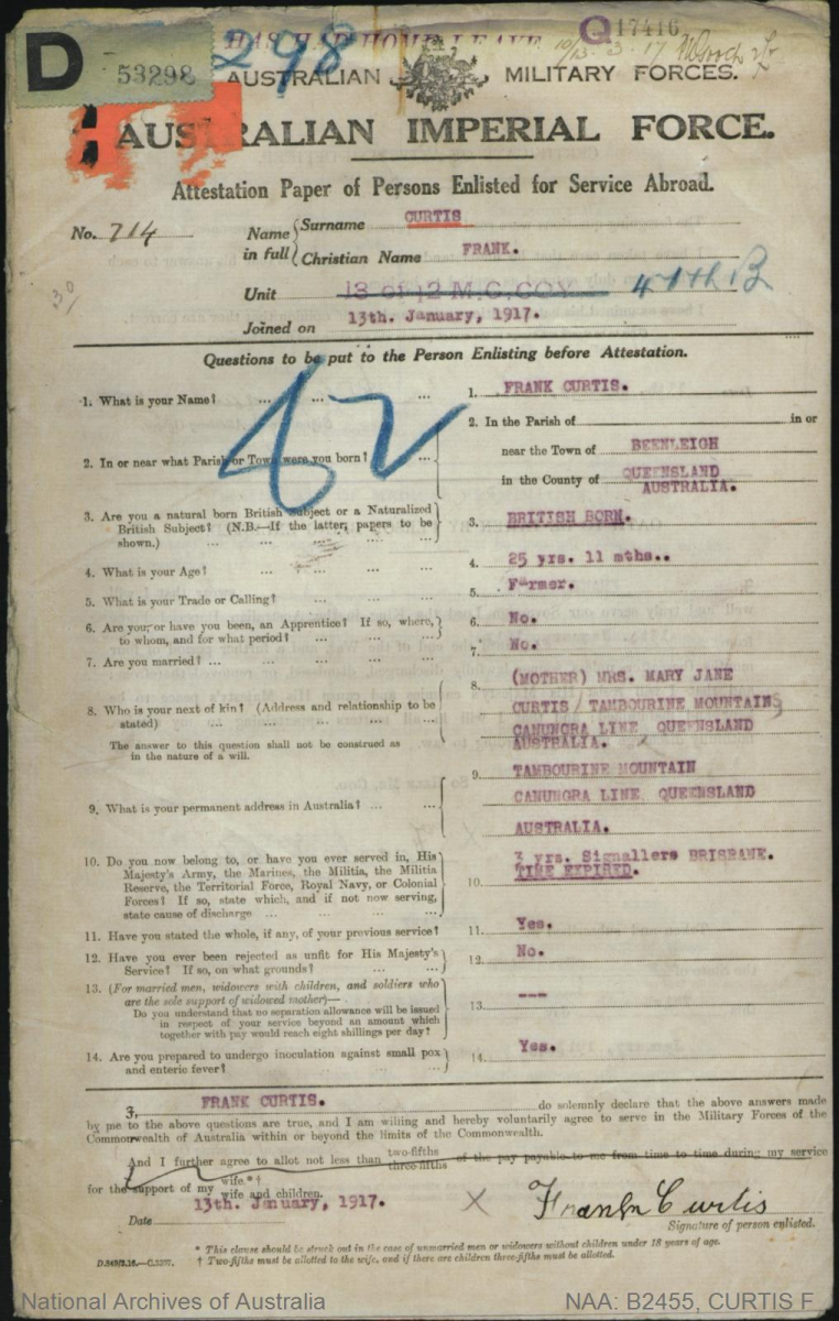 Frank Curtis was born in Beenleigh, Queensland, on the 21st of February 1894 to Mr Edmund Ford Curtis and Mrs Mark Jane Curtis (nee Pollock) as the fourth of their 11 children. His older siblings (from eldest to youngest) were William, Emily and Beatrice. His younger siblings (from eldest to youngest) were Lawrence and Ernest (twin brothers), Norman, Edmund, Jemima, Cyril and Lelia. Before his enlistment in the 47th Battalion, Frank Curtis lived in Tamborine Mountain where he worked as a farmer. The 47th Battalion was raised in Egypt on 24 February 1916 as part of the "doubling" of the AIF. Approximately half of its new recruits were Gallipoli veterans from the 15th Battalion and the other half fresh reinforcements from Australia. Reflecting the composition of the 15th, the new battalion was composed mostly of men recruited in Queensland and Tasmania.