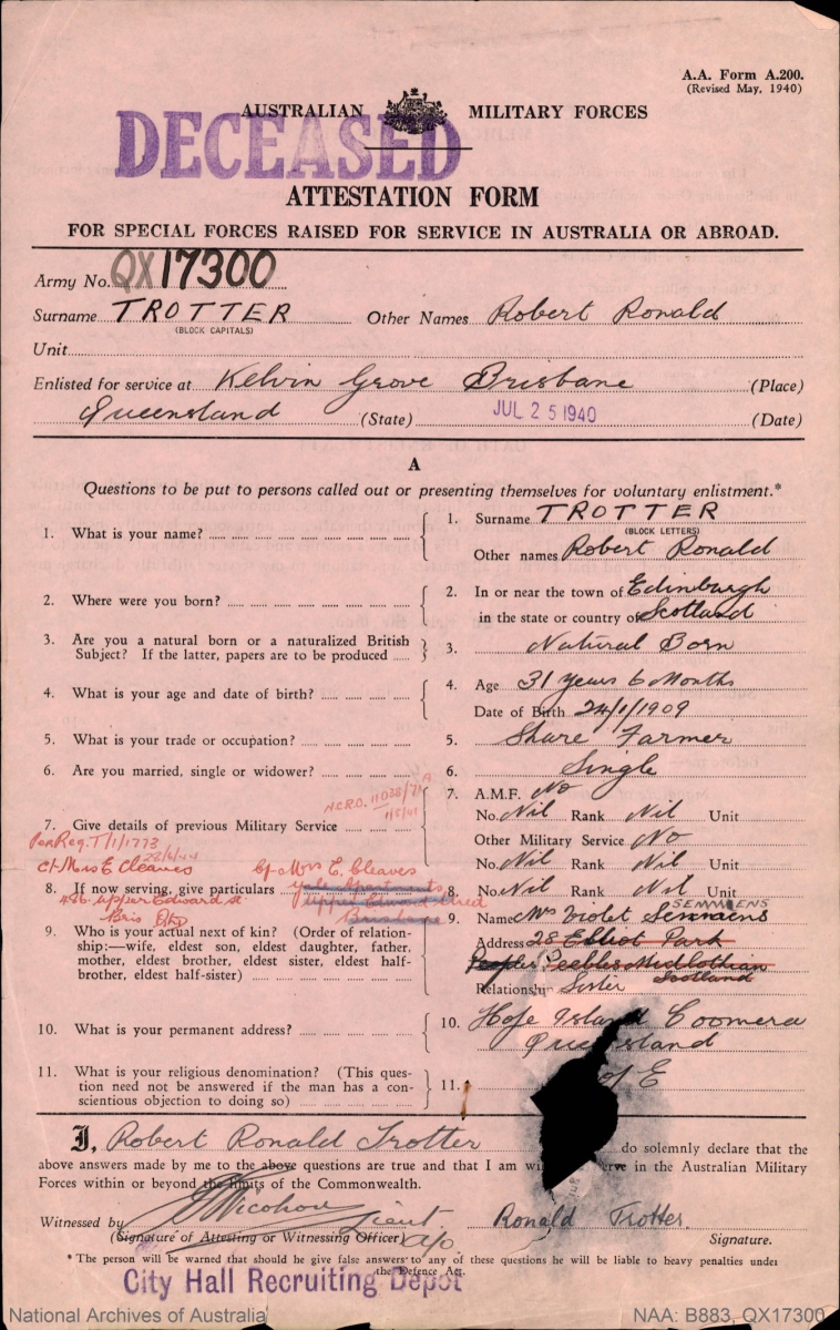 Robert Ronald Trotter was born in Edinburgh, Scotland on the 29th of January 1909 to Mr Robert Trotter and Mrs Helen Trotter (nee Simpson). Robert had at least one sibling, his older sister Violet. I believe that he had other siblings, however I cannot be certain as the official Scottish registry provides limited information. Robert migrated to Australia in 1926 aged 17, arriving in Queensland on 13th of September 1926 on the ship Euripides. He seems to have lived in various locations across Queensland with his last address listed as Hope Island, where he made a living as a share farmer. Although he listed his sister Mrs Violet Semmens as his next of kin, he was engaged to a young widow from Brisbane called Mrs Eva Cleave.