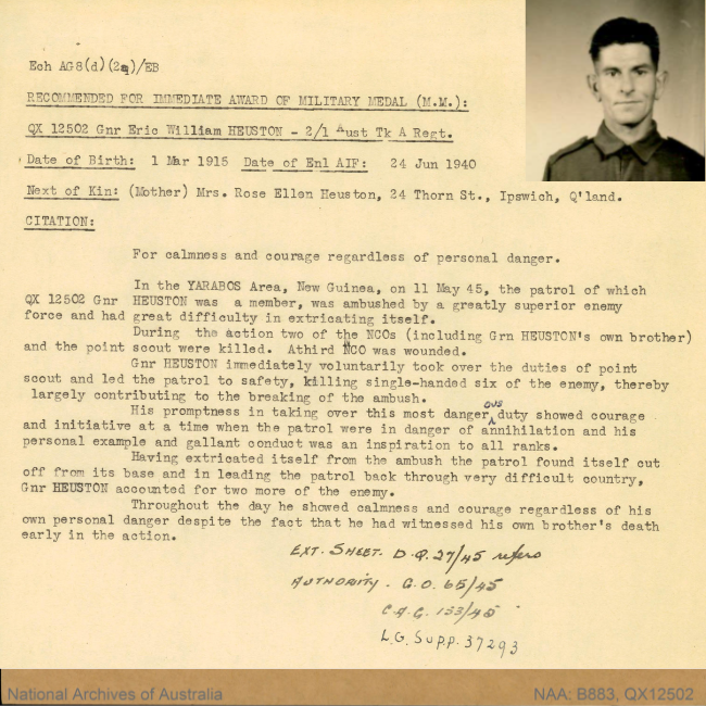 On the 11th of May 1945, Gunners Eric Heuston and Bombardier Valera Heuston were on patrol in the Yarabos area, with Valera serving as the point scout (front of the patrol). Their patrol was ambushed by a numerically superior Japanese force which killed several members of the patrol, including Valera. Despite his brother’s death, Eric took over the role of point scout and led the patrol to safety, killing 8 Japanese soldiers in the process, an act for which he was awarded the Military Medal (the full recommendation for his award is below). This battle took place in the Aitape-Wewak Campaign in Northern New Guinea. This was one of the final campaigns undertaken by Australian forces in the Pacific theatre during the Second World War.