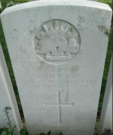 The 26th of June 1918 saw several artillery duels fought between the Germans and allied gunners near the village of Villers-Bretonneux where the 41st Battalion was stationed. Several casualties were sustained by the 41st Battalion including Private Ernest Thacker. This occurred when he was acting as a temporary stretcher bearer, attending to the wounded near Villers Bretonneux at 3.30pm on 26 June 1918. Pte Thacker had stopped to render assistance to Sergeant Llewellyn Richards who had been hit by shell fire when a second shell expolded nearby killing Pte Thacker and inflicting aditional wounds on Sgt Richards.